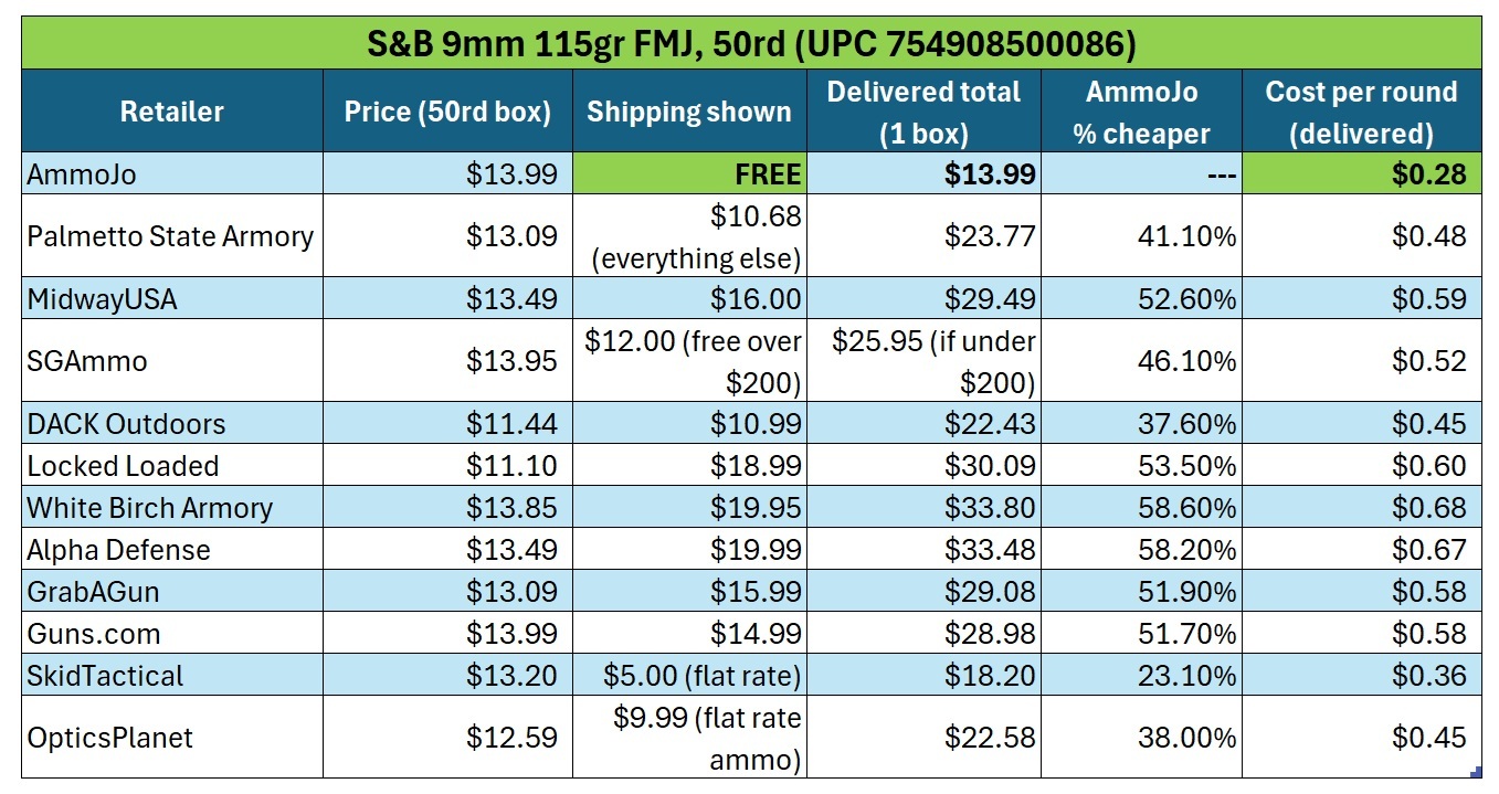 Live delivered-price snapshot: S&B 9mm 115gr FMJ, 50rd (UPC 754908500086)